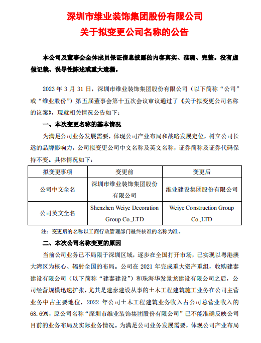 維業股份:關于公司擬變更名稱的公告