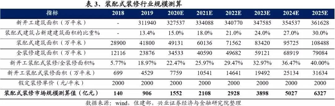 近日,興證研究發(fā)布裝配式裝修行業(yè)深度研究報告,測算2025年裝配式裝修市場規(guī)模將達(dá)到6327億元,年化復(fù)合增速為38.26%。保障房、長租公寓、租賃房、酒店等對裝配式裝修需求的穩(wěn)中有升,成品住宅比例持續(xù)提升帶來的較大潛力,未來將催生裝配式裝修巨大市場空間。