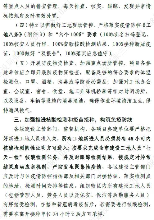 3、各級建設主管部門、監督機構,各項目參建單位要嚴格把好新進工地人員準入關,所有工地新進人員必須持有48小時內核檢測陰性證明方可進入。