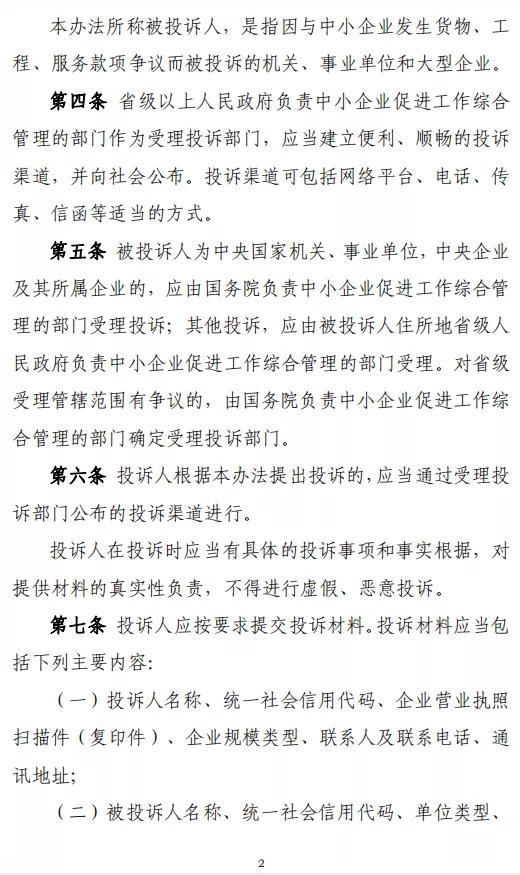中小企業就機關、事業單位和大型企業違反合同約定拒絕或者遲延支付貨物、工程、服務款項提起投訴,省級以上人民政府負責中小企業促進工作綜合管理的部門受理投訴,有關部門、地方人民政府對投訴做出處理,適用本辦法。