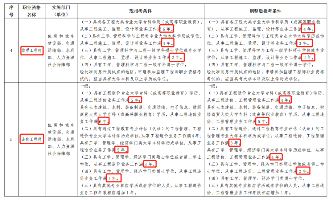 3月11日,中國(guó)人事考試網(wǎng)發(fā)布了《人力資源社會(huì)保障部關(guān)于降低或取消部分準(zhǔn)入類(lèi)職業(yè)資格考試工作年限要求有關(guān)事項(xiàng)的通知》,通知中提到降低或取消《國(guó)家職業(yè)資格目錄(2021年版)》中13項(xiàng)準(zhǔn)入類(lèi)職業(yè)資格考試工作年限要求。其中包括建造師(一級(jí))、造價(jià)工程師、監(jiān)理工程師、注冊(cè)安全工程師(中級(jí))等。
