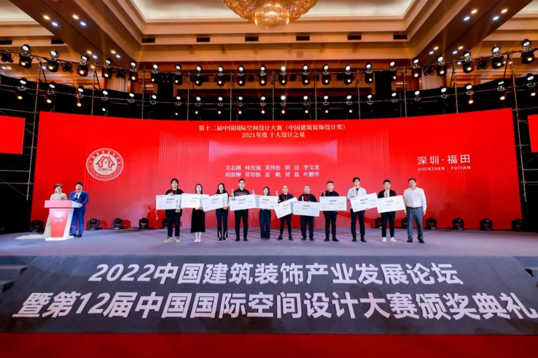 活動中,第十二屆中國國際空間設計大賽各項獲獎名單正式揭曉,2021年度“十大設計之星”:文志剛、林光福、莫偉倫、胡達、李寶龍、胡游柳、常培棟、雷帆、劉磊、葉鵬華登上中國建筑裝飾設計界至高榮譽的舞臺,接受表彰。