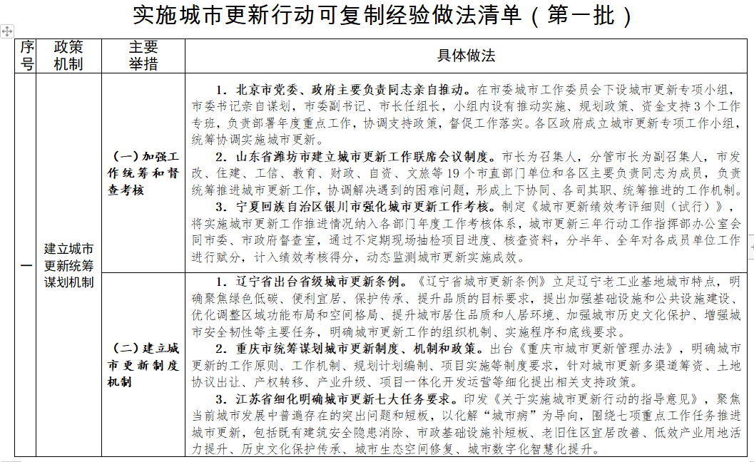 近日,住房和城鄉(xiāng)建設(shè)部總結(jié)城市更新試點(diǎn)城市和各地經(jīng)驗(yàn)做法,印發(fā)《實(shí)施城市更新行動(dòng)可復(fù)制經(jīng)驗(yàn)做法清單(第一批)》。