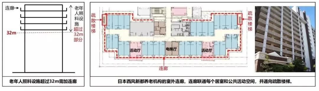 新規范 5.5.13A:建筑高度大于32m的老年人照料設施,宜在32m以上部分增設能連通老年人居室和公共活動場所的連廊,各層連廊應直接與疏散樓梯、安全出口或室外避難場地連通。
