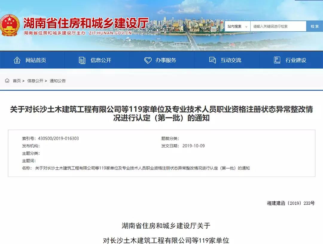 10月9日,湖南省住建廳通報119名人員注冊狀態異常。