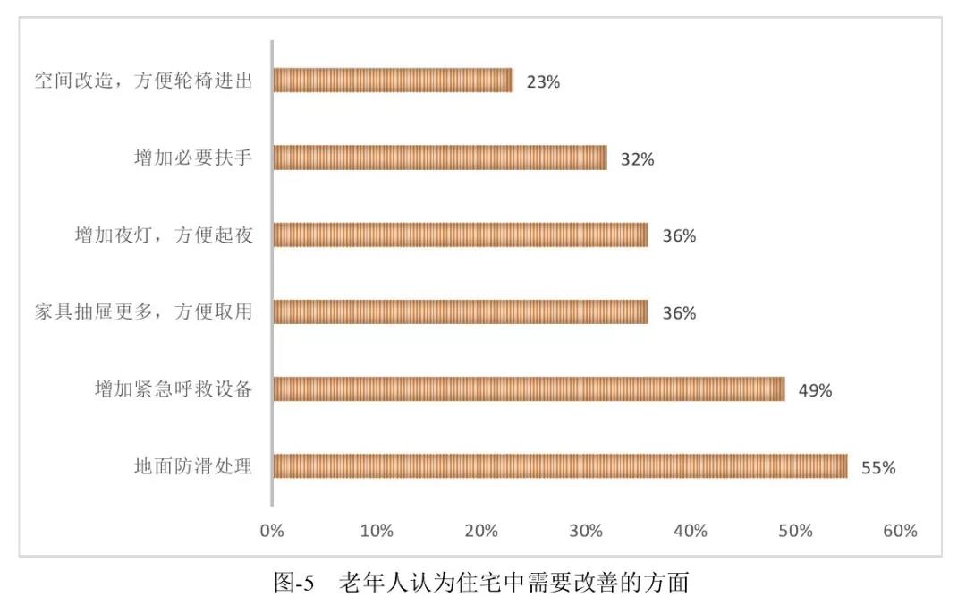 調查結果顯示,約50%的受訪者認為地面需要做防滑處理;約23%的受訪者認為當前的居住環境受到噪音影響;約16%的受訪者認為當前住宅內的設備不齊全;此外,居住環境光照通風欠佳、緊急呼救裝置缺乏等問題也是當前老年人居住環境中急需解決的......